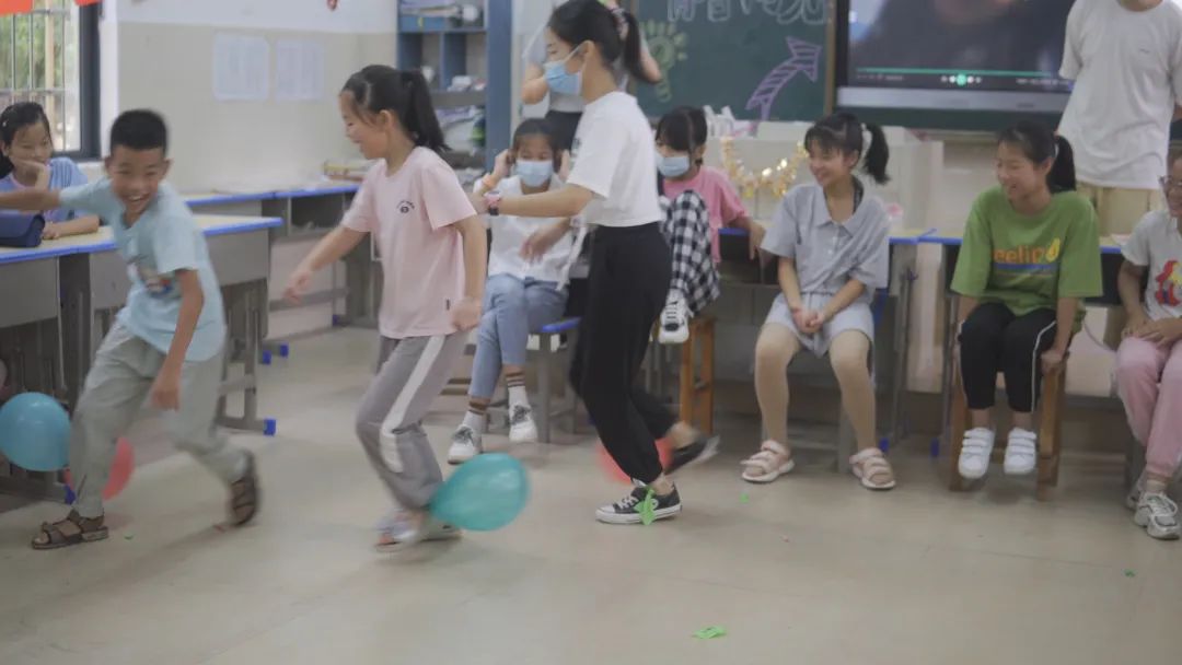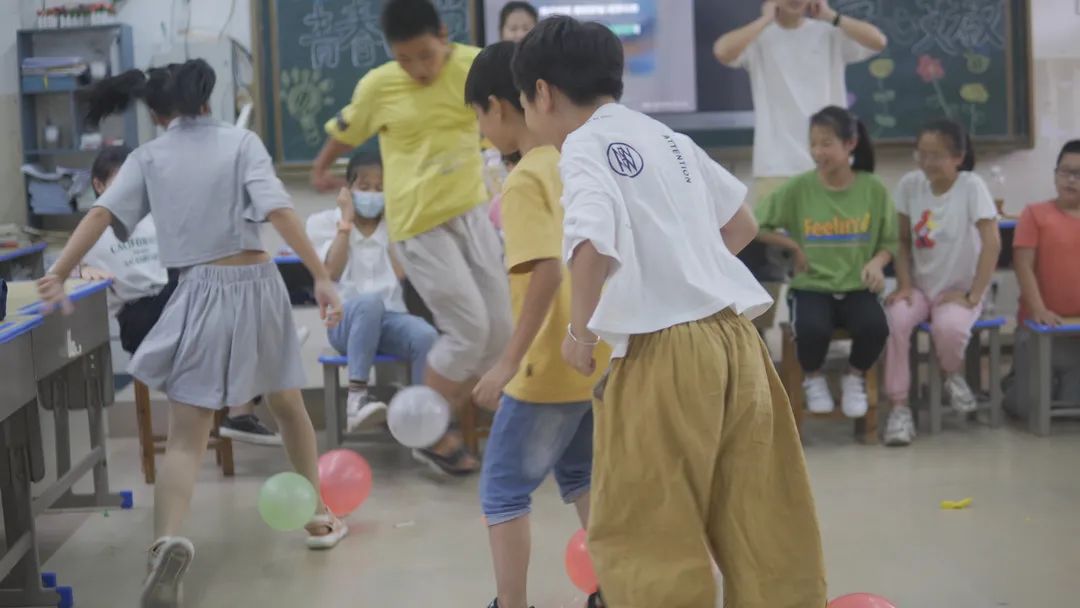 “砰砰啪啪、砰擦……”紧接着,教室里传来一阵阵刺耳的爆炸声以及孩子们的欢叫声。孩子们对踩气球游戏兴致盎然,大家吵闹着,欢笑着,随着游戏伴奏来到了最后的环节 ——我们向孩子们展示了这两周的温馨相册,里面有他们可爱的照片。在这之后,“青春向党,爱心支教”全体成员与所有孩子进行了合影留念。