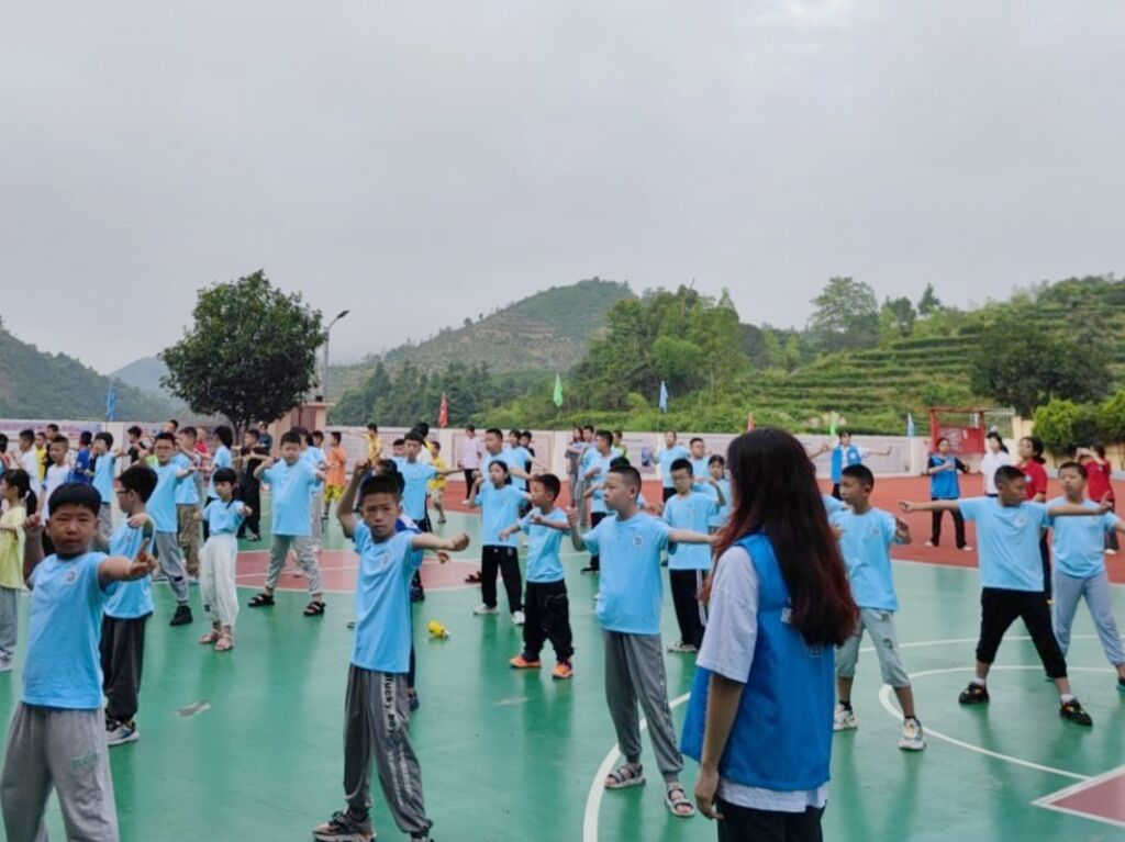 团队成员监督孩子们练习八段锦