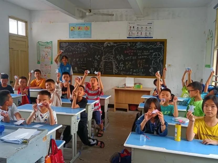 团队成员彭箫与孩子们展示折纸作品
