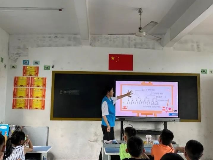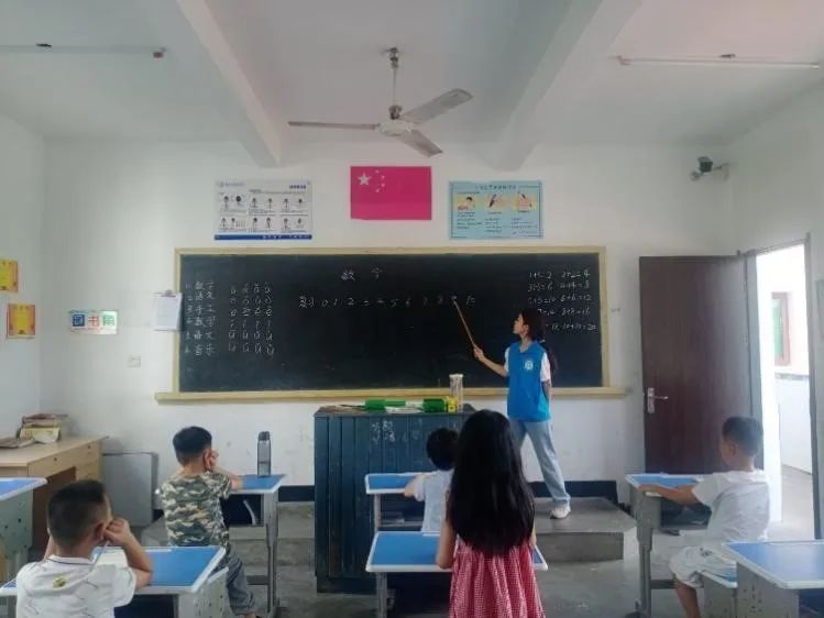 团队成员苏鑫玲在教孩子们认识数字