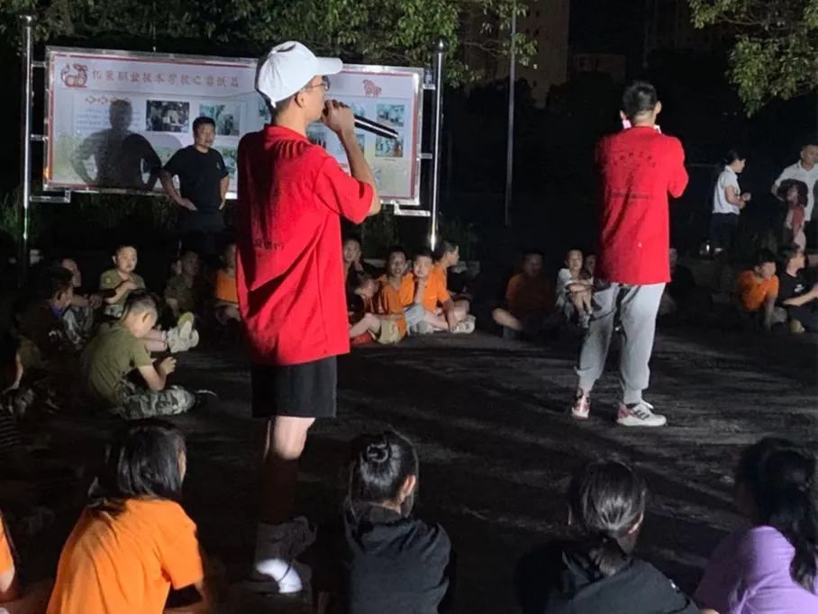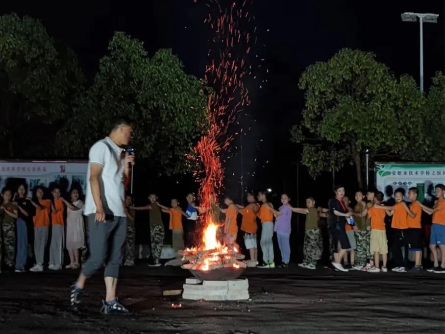 晚上,一场别开生面、热闹非凡的篝火晚会在操场举行。实践队队员们及当地老师与孩子们在篝火旁快乐地舞动。接下来,实践队队员们与当地老师一齐欣赏孩子们准备的精彩表演。在篝火的照耀下,每位成员一齐做游戏,整个操场上充满了欢声笑语。