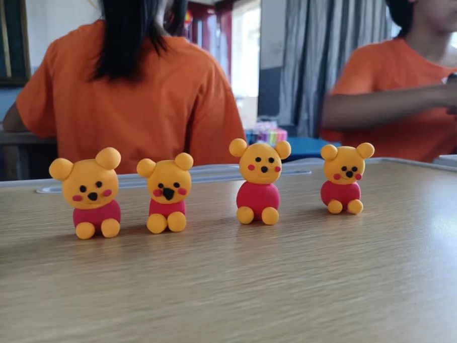 早晨,阳光明媚。为了提高小朋友们的动手能力及创新能力,实践队队员们为小朋友们带来了有趣的手工课。实践队队员们通过播放视频的方式,手把手地教小朋友们把粘土塑造成可爱的维尼熊的形状。完成课程任务后,接下来的课程的时间交给小朋友们自由发挥,小朋友们通过自己的想象力,捏出了仙人掌、郁金香、汉堡等形状。本次课程培养了小朋友的创新思维,提高小朋友们的创造力,也使小朋友们的动手能力得到了极大的提高,能够提高小朋友们的自信心。