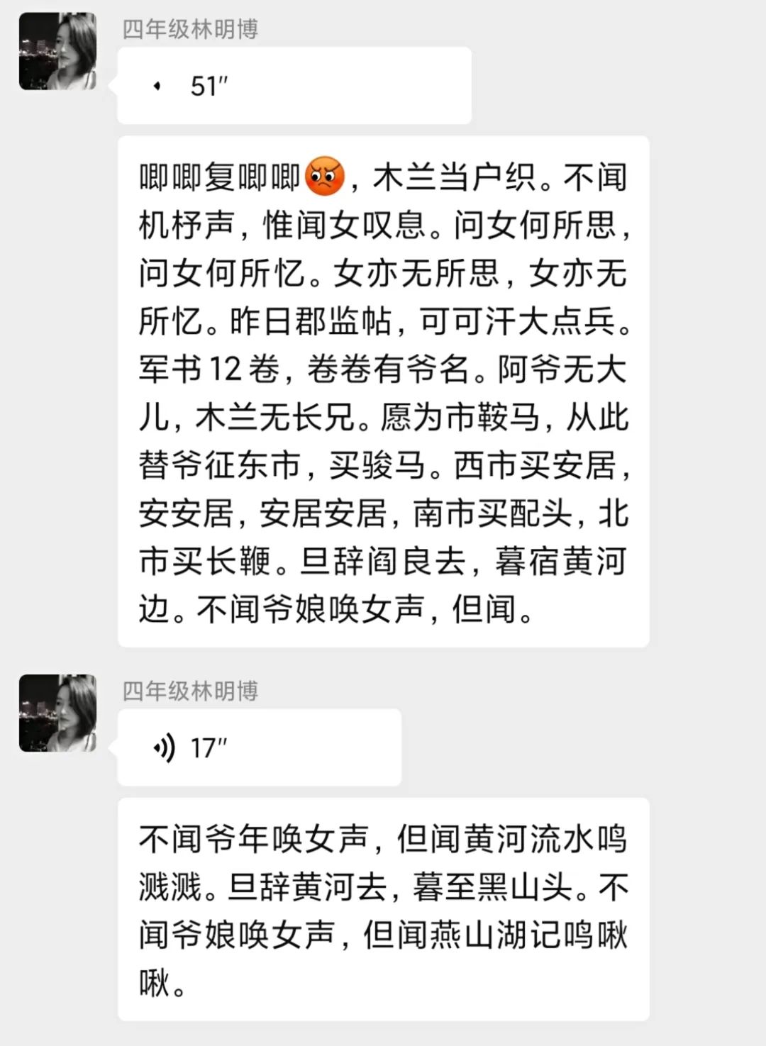 国学经典课上,队员王韵棋带领小朋友们认识了乐府诗和木兰从军的故事,屏幕前小朋友们也跟着朗读视频发出了自己的声音。课后,小朋友们也通过录音展示了自己的学习成果。