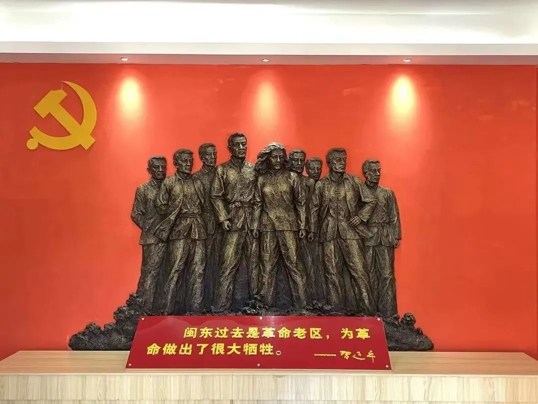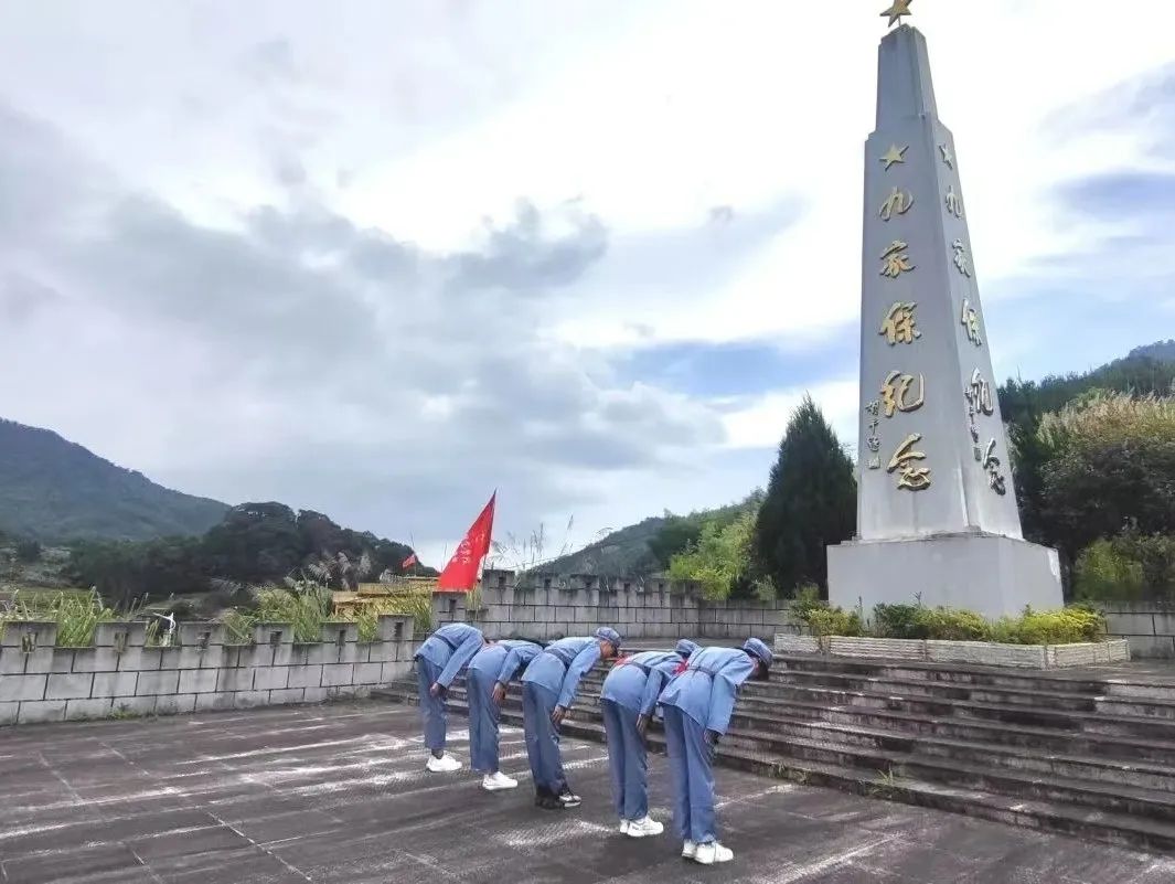 团队成员身着红军装于“闽东苏区,红色经典”石碑前向革命先烈致敬