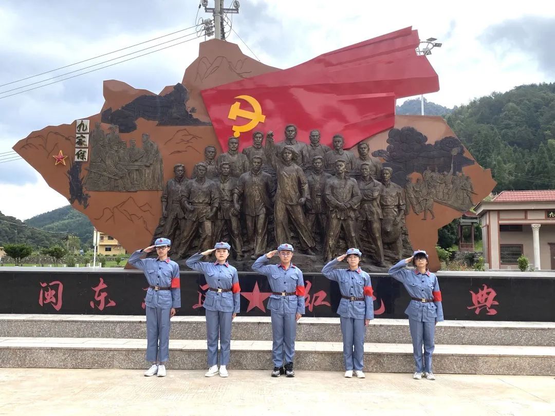 团队成员身着红军装于“闽东苏区,红色经典”石碑前向革命先烈致敬