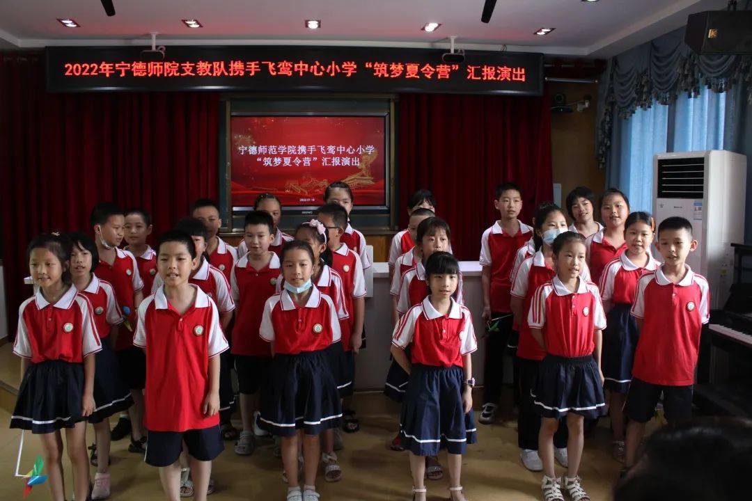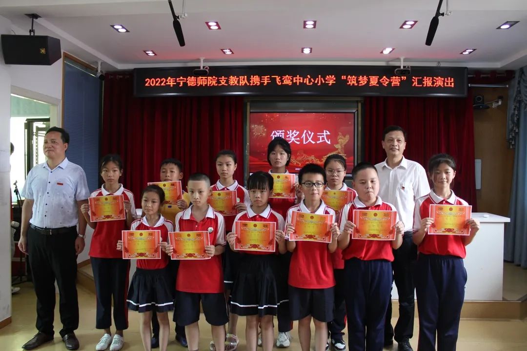 7月18日是支教活动的最后一天,支教队在飞鸾中心小学多媒体教室举办“筑梦夏令营”汇报演出活动。飞鸾中心小学副校长裴友满、飞鸾中心小学办公室主任苏建连、飞鸾中心政教处主任张爱平、飞鸾中心小学教务处主任陈昆明、宁德师范学院生命科学学院党委书记张秋良、宁德师范学院生命科学学院团委书记兼学工办副主任王永吉、宁德师范学院飞鸾中心小学支教队指导老师王珂参加此次活动。