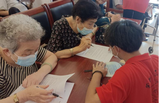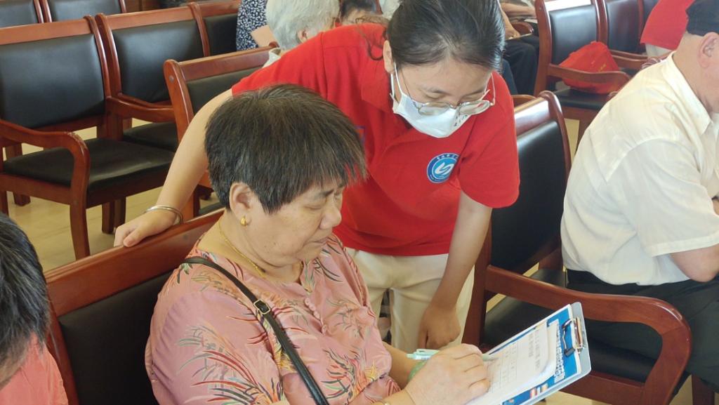 在讲座前,在金泰园负责人的安排下,由成员上台先给老人们大致介绍了此次活动整体流程。接着我们进行了第一个环节,对老人们进行一个相关阿尔茨海默病预防知识的问卷调查,在问卷过程中,由于一些老人们认字困难,团队成员耐心细心地帮助爷爷奶奶顺利完成了问卷调查,并从其中让老人们了解到一些如何预防阿尔茨海默病的相关知识,大家都活力满满,氛围浓厚!