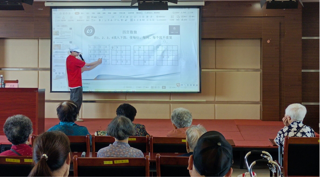 在讲座开始前,我们精心为老人们准备了一个动脑小游戏——数独。由团队队员讲解游戏规则后,老人们开始陆陆续续沉浸在数独游戏中。虽然有一些老人不曾玩过此类游戏,但是在团队队员的悉心协助下,老人们很快便学会了如何“破解”四宫独数。