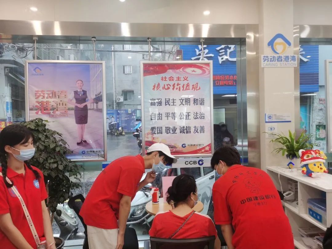 7月1日,我们在中国建设银行柘荣支行进行实践便民服务活动。一直以来,中国建设银行秉持“开放共享,责任担当”的理念,用心服务客户,用爱温暖客户,在全行营业网点打造“劳动者港湾”服务品牌,进一步开放网点服务资源,真诚地服务广大劳动者。“劳动者港湾”为劳动者免费提供饮水、休息、充电、应急外敷药品、爱心雨具、阅读书籍等服务,主动以金融力量解决社会痛点难点问题,更好地赋能社会。实践队寻找为建设美丽柘荣而辛勤劳动的劳动者们,引领他们到劳动者港湾休息区,实践队员热情服务辛苦劳累的劳动者们,为他们提供温馨服务,并且准备了各色各样的小礼品。与劳动者们面对面亲切地交流,使我们充分体会到了劳动者工作的辛苦与不易。建行通过“劳动者港湾”每一处细节的改善、服务的改进,实实在在为公众递温暖、解难题。广大劳动者切实感受到了建行及实践队员的爱与关怀。“劳动者港湾”已成为建设银行乃至整个金融业标志性的公益服务品牌,且“劳动者港湾”体现的“开放共享,责任担当”的理念以及服务资源开放共享模式,为各行各业提供了可借鉴的思路和方法,在全社会产生“同频共振”效应。