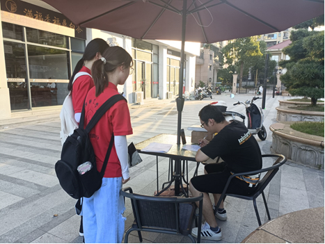 而针对老年群体队员会采用交谈的方式进行填写问卷。随后队员们扩大调查范围,在人民广场周围社区进行调查,周围社区居民也积极参与实践队的调研活动,帮助填写问卷等。