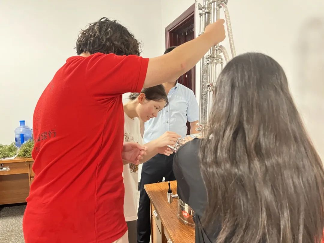 当晚,同学们在老师的带领下再次尝试了煎牛排与提纯纯露。老师详细介绍了纯露提纯的过程、手法、注意事项,耐心地讲解了每一步操作。同学们也积极参与到纯露的提纯操作中,协助老师共同完成每一道工序。在煎牛排的过程中,同学们大胆尝试,彼此分工合作,将迷迭香加入牛排,创新出不同风味的牛排。