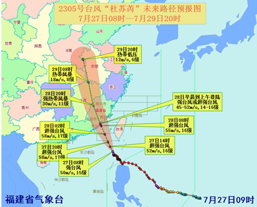 “杜苏芮”今天8时中心位于福建南部沿海东南方向约450公里的海面上(北纬20.5度、东经119.9度),中心附近最大风力15级(50米/秒,强台风级)。预计“杜苏芮”将以每小时15公里左右的速度向西北方向移动,逐渐向我省南部沿海靠近,强度有所增强,最大可能于28日早晨到上午在我省晋江至东山一带沿海登陆,登陆时中心附近最大风力为14~16级(强台风级或超强台风级)。