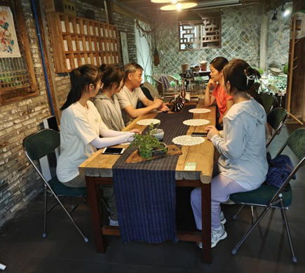 在“同顺泰”茶馆,队员们见到了黄红心老师,大家与馆主畅聊白茶历史和文化,感叹古今交汇的时代之变,聆听黄老师结合白茶特色实践创新的茶饮料、茶食、茶香皂的故事,并请教了福鼎茶旅的开发建议。