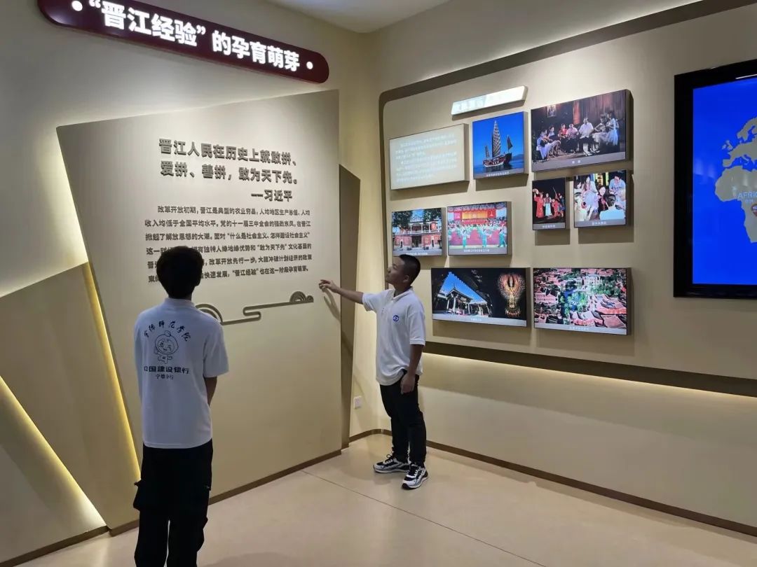 晋江经验馆全馆以图片、文字、模型、影片为主要展示手段,通过影视、珍贵图片、实物展示和情景再现等手法,辅以数码互动、多媒体查询系统、数字沙盘等现代技术,全方位、多视角地展示习近平总书记总结提出“晋江经验”的实践探索和理论思考,以及晋江市践行发展“晋江经验”所取得的辉煌成就。实践队员在馆内沉浸式参观,积极讨论,深刻领悟晋江人“爱拼才会赢”的奋斗精神和“敢为天下先”的探索精神。