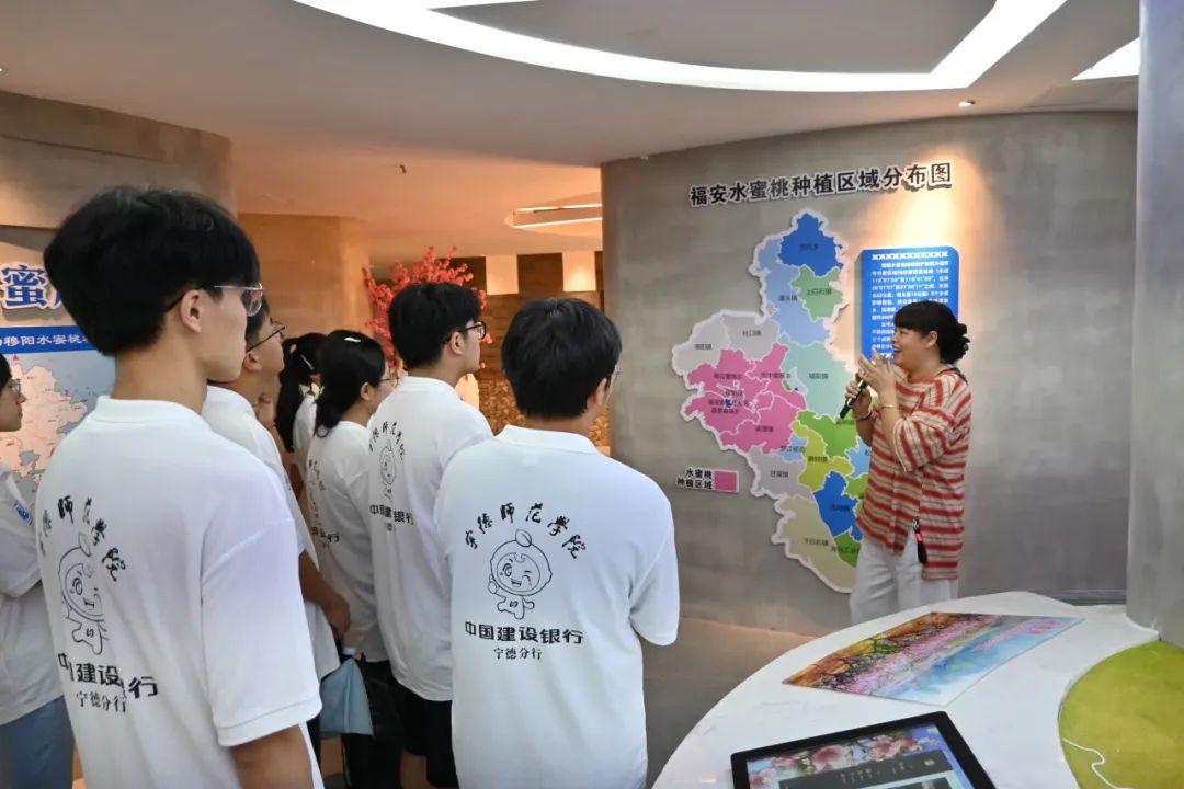 实践当天,实践队队员们来到了穆阳水蜜桃产业中心。实践队员在产业中心负责人的带领下参观了穆阳水蜜桃展厅,负责人讲述了福安水蜜桃的种植历史,以及福安人民的辛勤劳作。此外,队员们还了解到穆阳水蜜桃的发展也离不开科技创新,桃园的管理设置了一个“智慧果园”的系统,做到一个标准化栽培的园区建设。
