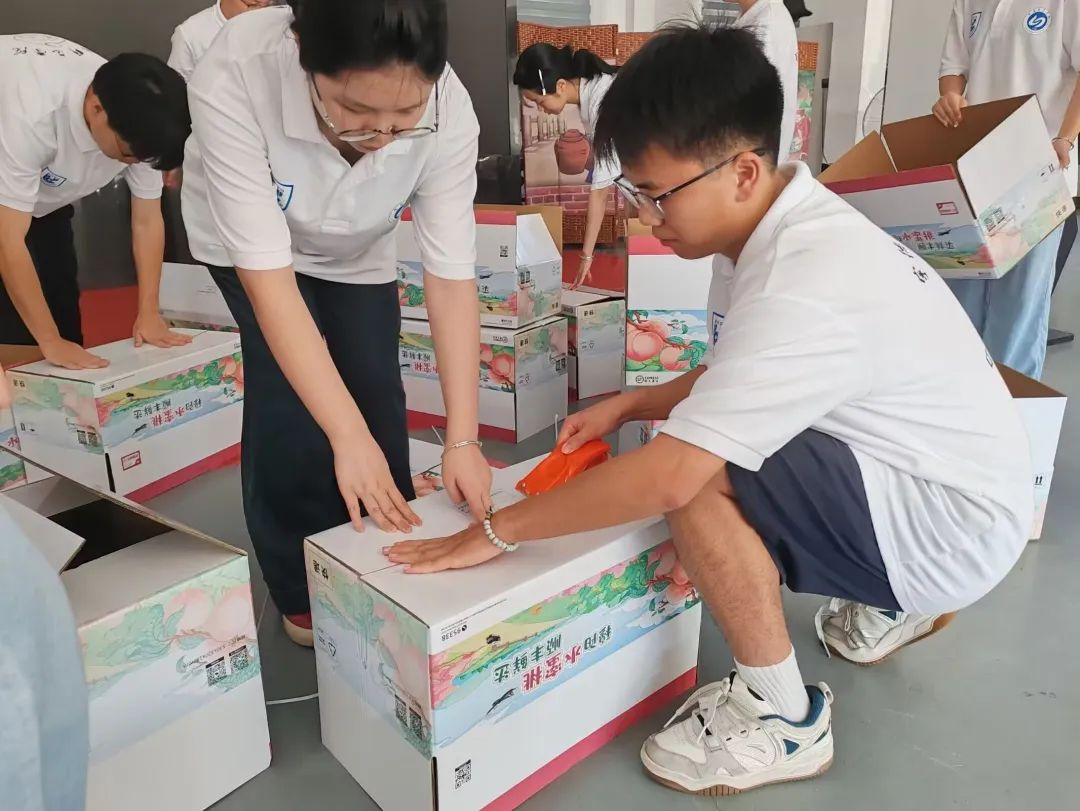 同时,实践队队员们在专业人员的指导下体验了水蜜桃装箱的过程,先将纸板折成纸箱,在底部贴上胶带,接着将水蜜桃放入折好的纸箱中。