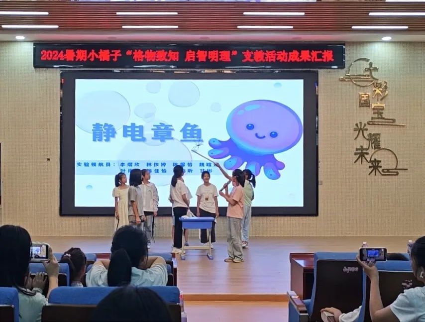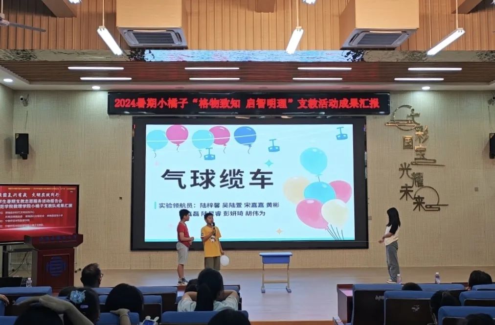 实验是物理学习的基础。开班仪式上,小橘子支教队的队员们为学生们展示了静电章鱼、气球缆车、空气炮、水火箭四个科学实验,并带领同学们动手尝试,鼓励同学们将制作成果上台展示,激发孩子们对于物理实验的兴趣。