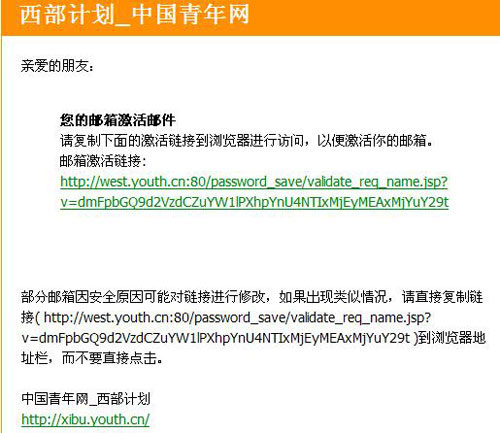 填写完个人邮箱后,点击“我要报名”后,页面会弹出对话框提示(http://west.youth.cn/password_save/send_username4emial.jsp):您的注册链接已经发到您的邮箱里,请登录您的邮箱完成注册!(见图四)